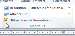 - Dans l’onglet « Diaporama », groupe de commandes « Moniteurs », cochez « Utiliser le mode présentateur ».